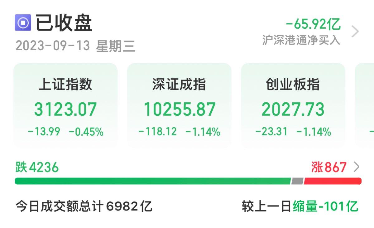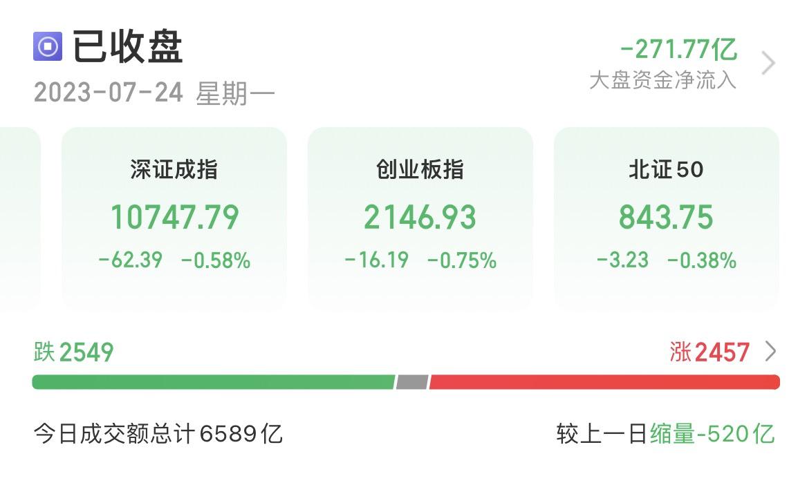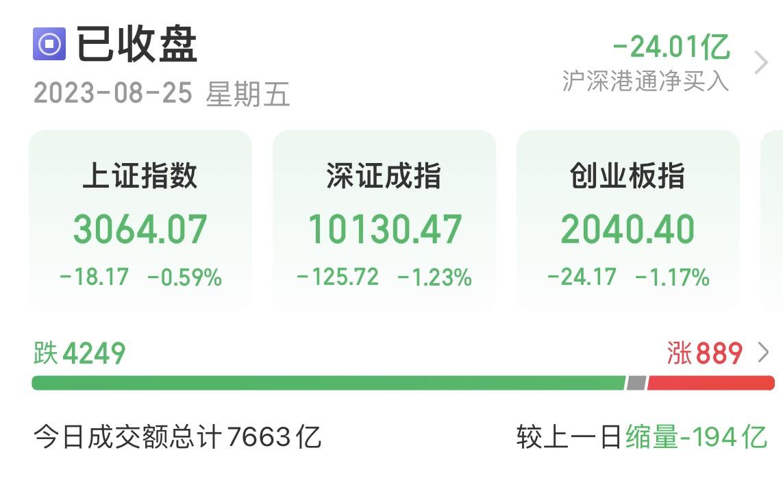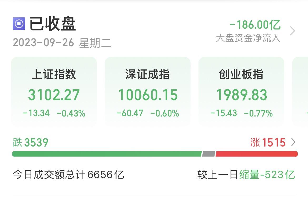 A股三大指数今日集体收跌,截至收盘,沪指跌0.43%,深成指跌0.60%,北证50跌0.57%,创业板指跌0.77%。沪深两市成交额6656亿元。两市超3500只个股下跌,北向资金净卖出62.69亿元。