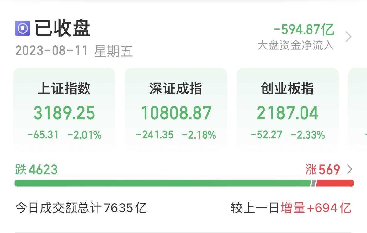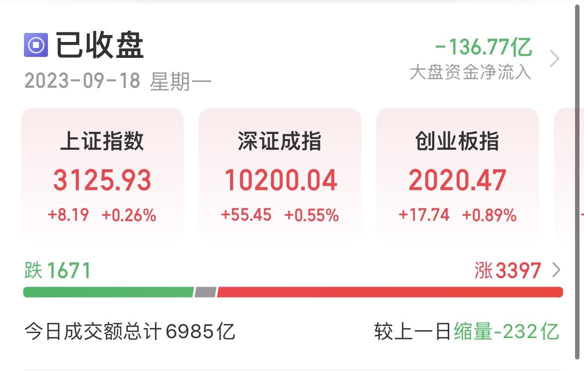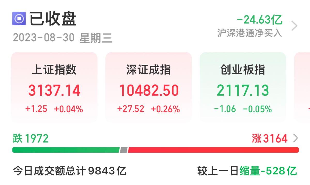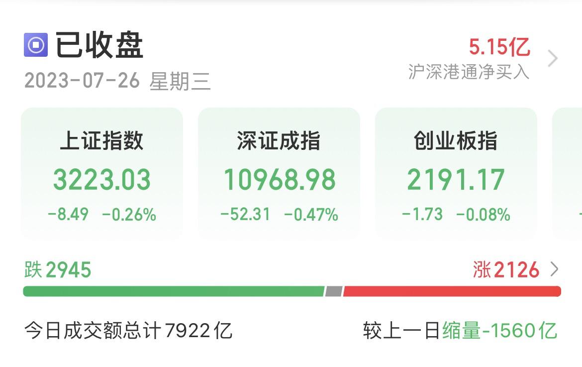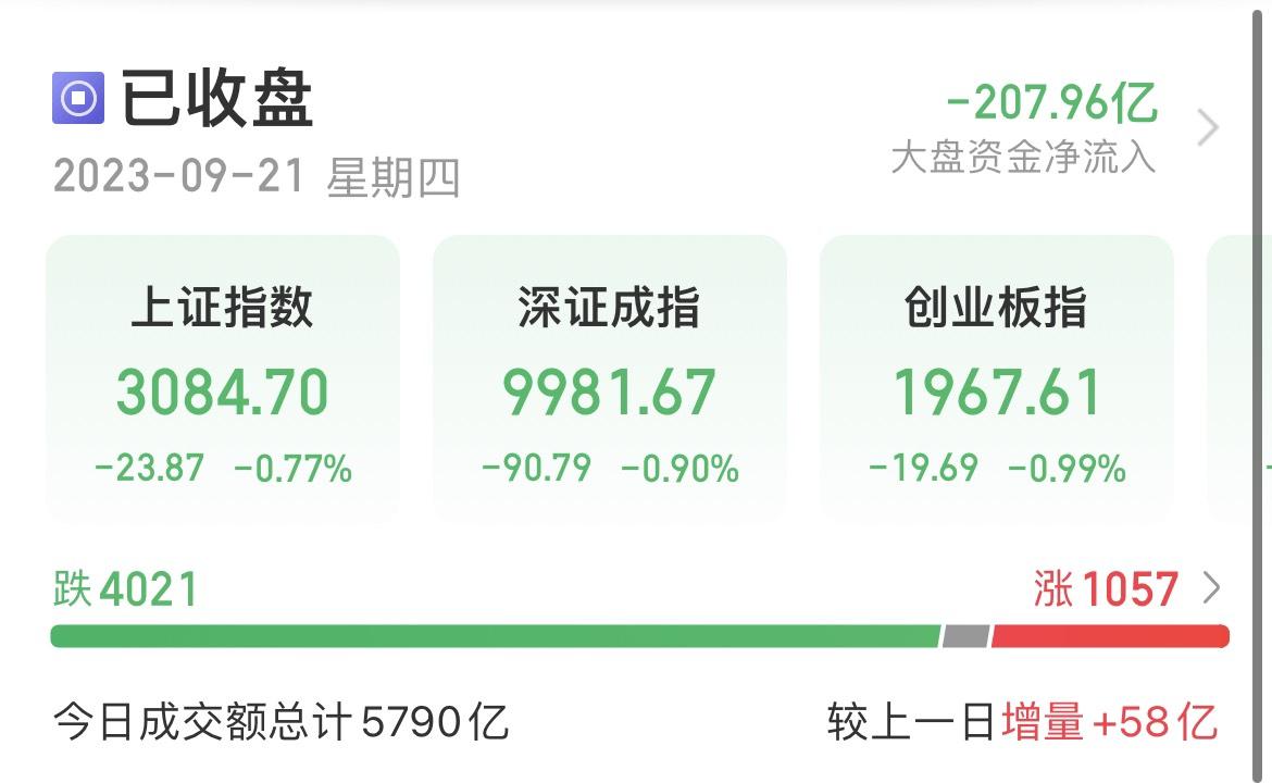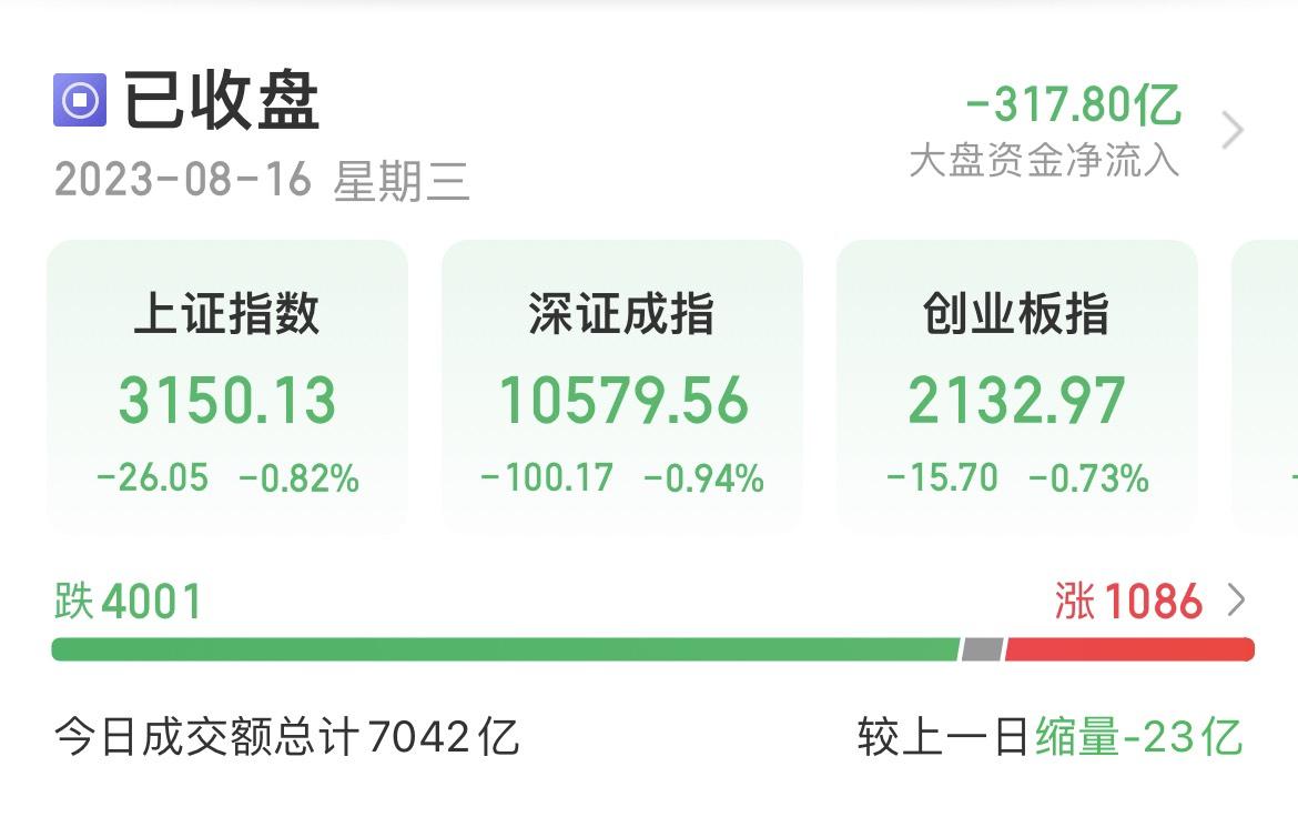 导语: A股三大指数今日集体收跌,截至收盘,沪指跌0.54%,深成指跌0.57%,北证50跌1.04%,创业板指跌0.40%。沪深两市成交额7179亿元。两市超3400只个股下跌,北向资金净卖出80.39亿元。板块题材上,减肥药、工业母机、F5G等板块涨幅居前;房地产开发、证券板块下挫。盘面上,华为产业链持续活跃,荣联科技午后涨停,捷荣技术涨停走出四连板股价创历史新高。减肥药概念领涨,常山药业、博瑞医药一度20cm涨停,德展健康、百花医药双双涨停。F5G概念涨幅居前,剑桥科技、华脉科技双双涨停,中贝通信涨停炸板,光刻机概念反弹,蓝英装备、张江高科领涨。工业母机板块活跃,德恩精工20cm涨停,亚威股份、奥普光电双双涨停。证券板块走低,太平洋、华创云信领跌,房地产开发板块跌幅居前,天房发展、金科股份等多股跌超4%。