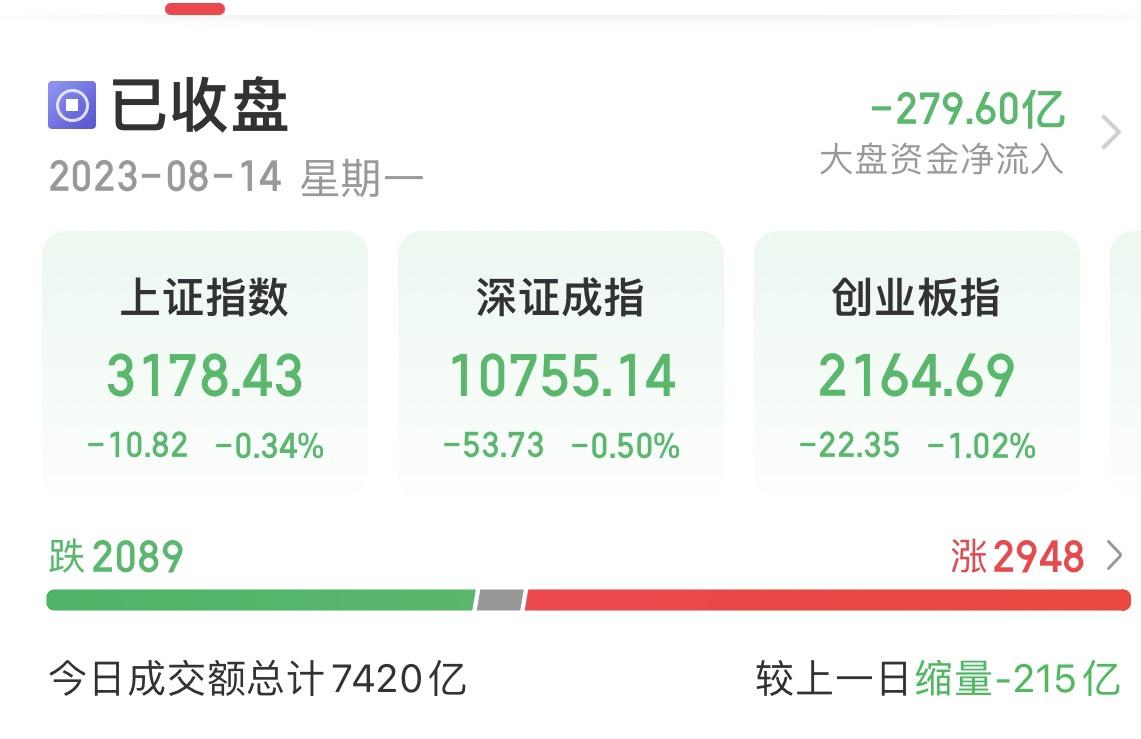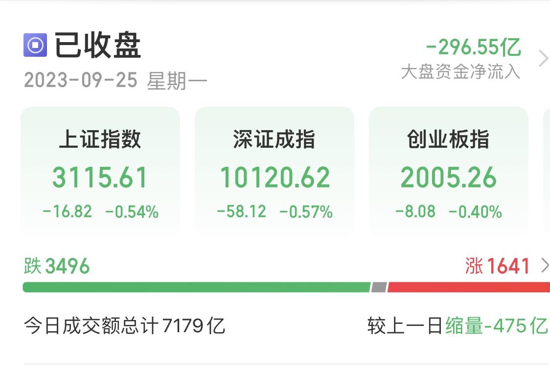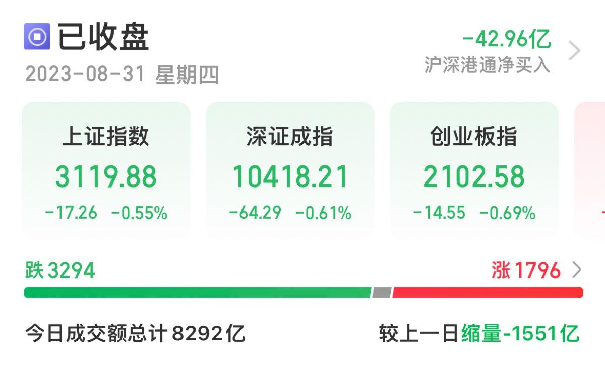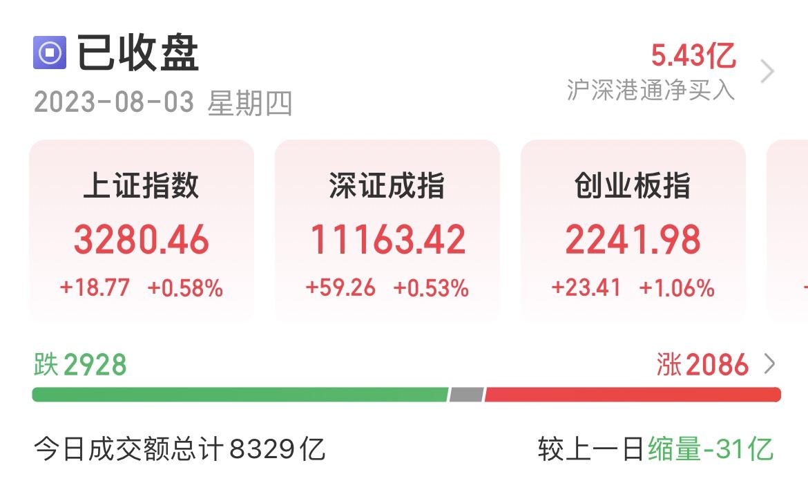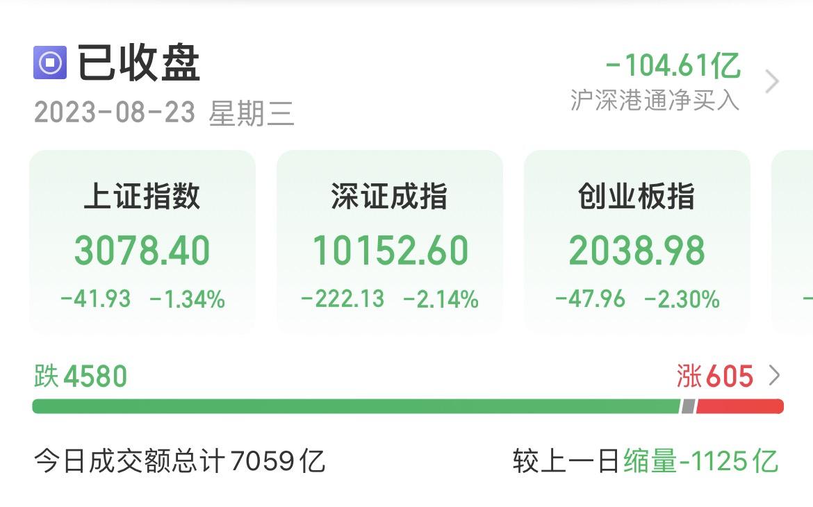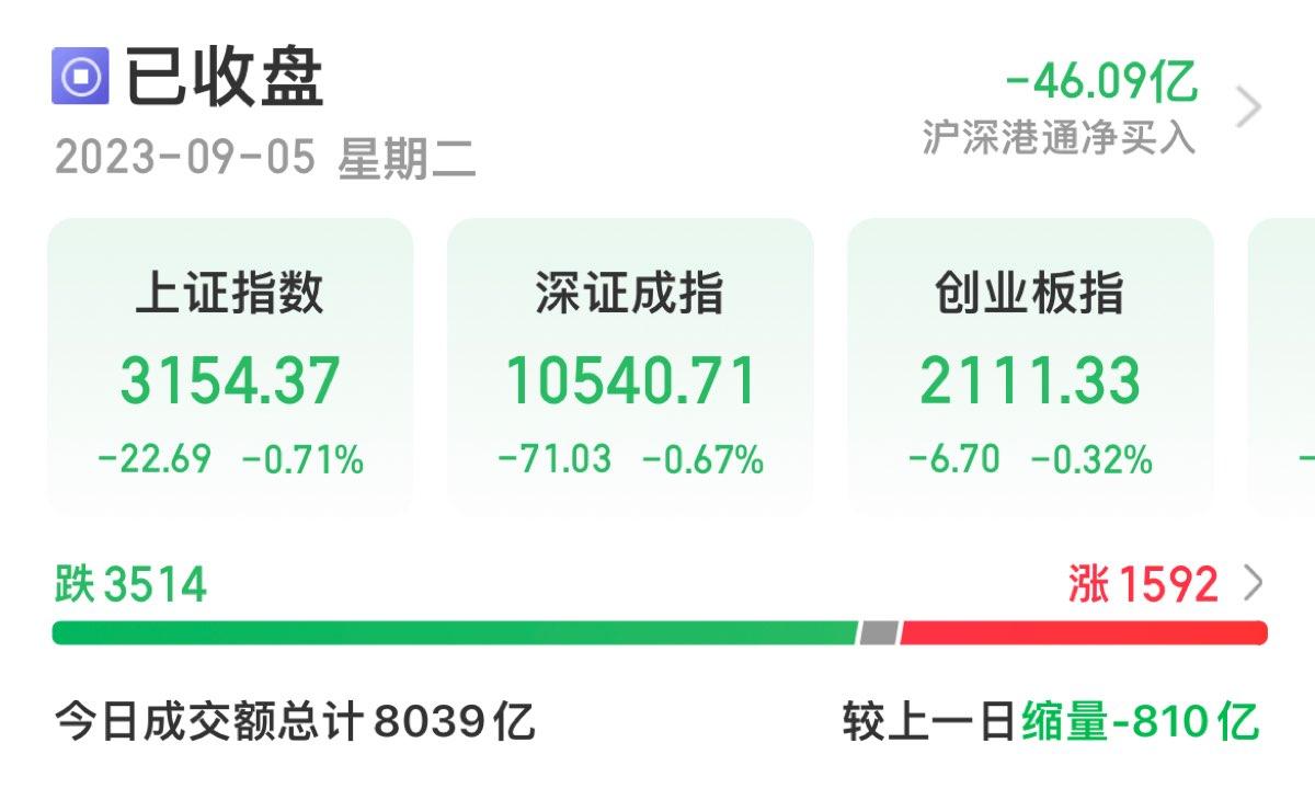 A股三大指数今日集体收跌,截至收盘,沪指跌0.54%,深成指跌0.57%,北证50跌1.04%,创业板指跌0.40%。沪深两市成交额7179亿元。两市超3400只个股下跌,北向资金净卖出80.39亿元。