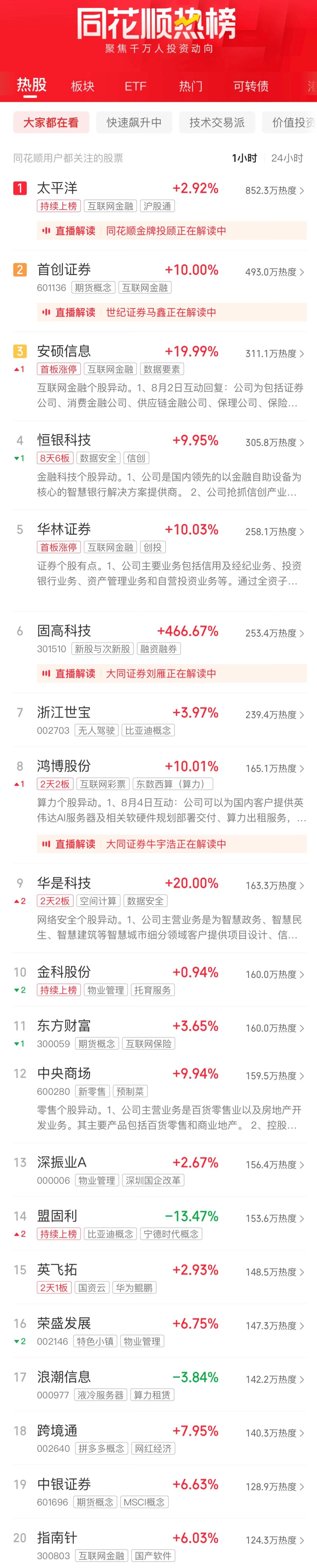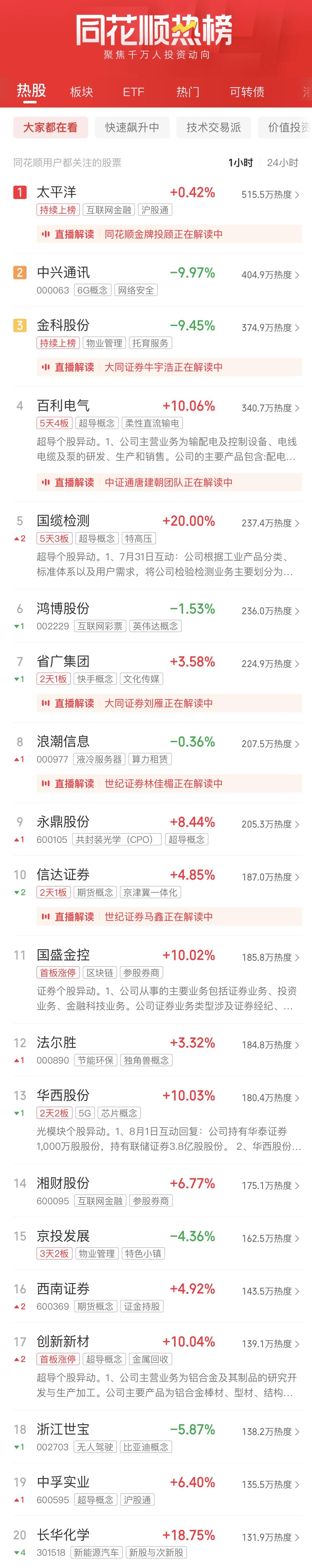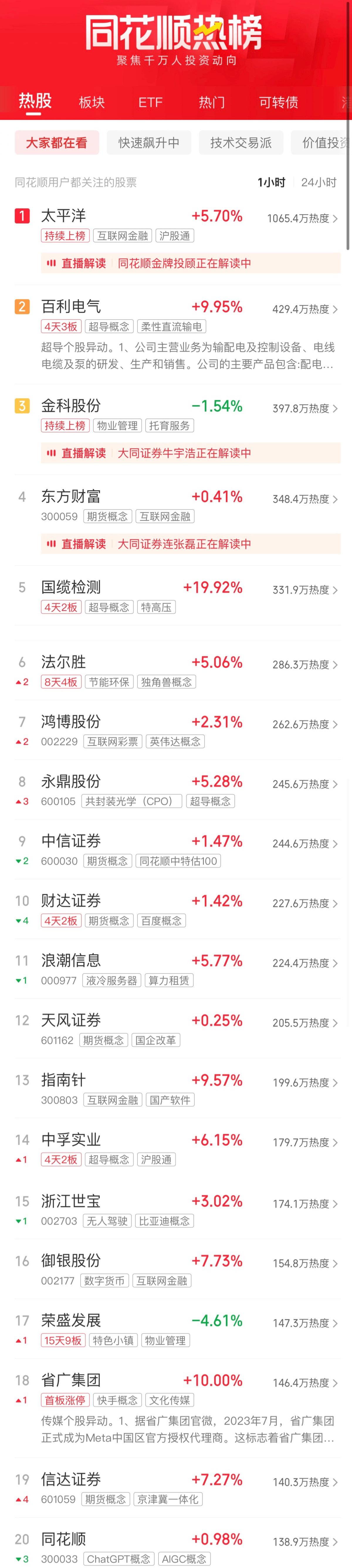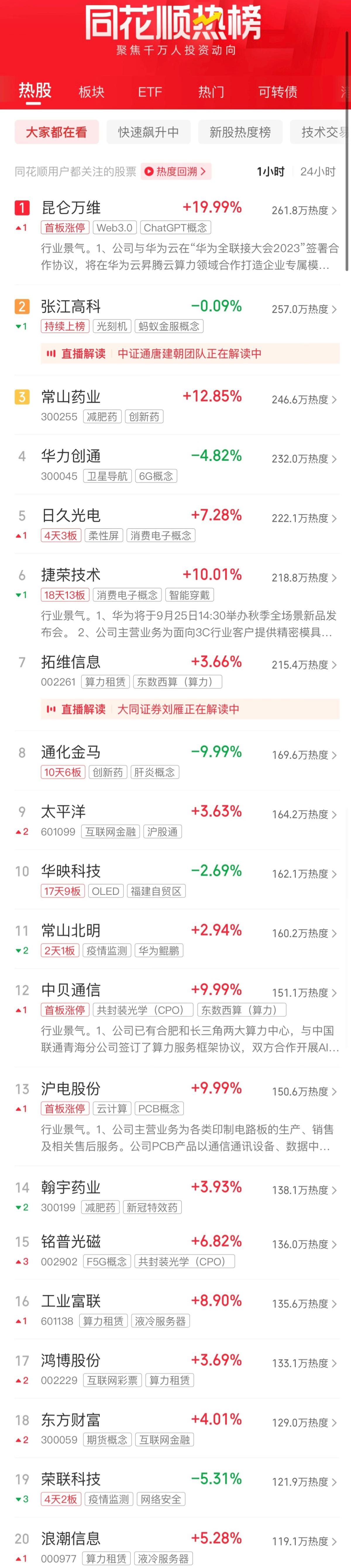 盘面上,华为产业链持续活跃,荣联科技(002642)午后涨停,捷荣技术(002855)涨停走出四连板股价创历史新高。减肥药概念领涨,常山药业(300255)、博瑞医药一度20cm涨停,德展健康(000813)、百花医药(600721)双双涨停。F5G概念涨幅居前,剑桥科技(603083)、华脉科技(603042)双双涨停,中贝通信(603220)涨停炸板,光刻机概念反弹,蓝英装备(300293)、张江高科(600895)领涨。工业母机板块活跃,德恩精工(300780)20cm涨停,亚威股份(002559)、奥普光电(002338)双双涨停。证券板块走低,太平洋、华创云信(600155)领跌,房地产开发板块跌幅居前,天房发展(600322)、金科股份(000656)等多股跌超4%。