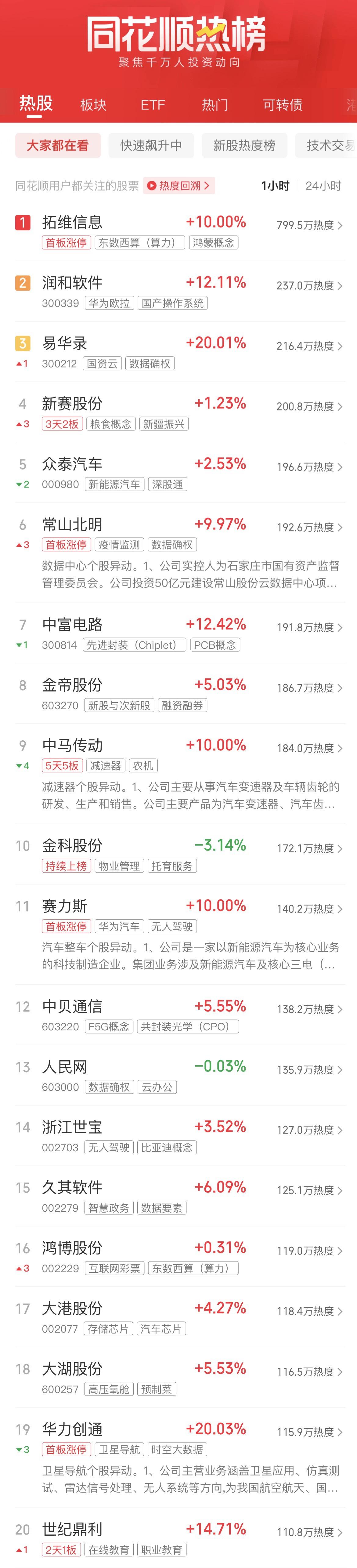 13:10 华为概念股午后异动,诚迈科技(300598)涨超12%,恒为科技此前涨停,软通动力(301236)、润和软件(300339)、菲菱科思(301191)、熙菱信息(300588)、四川九洲(000801)等跟涨。
