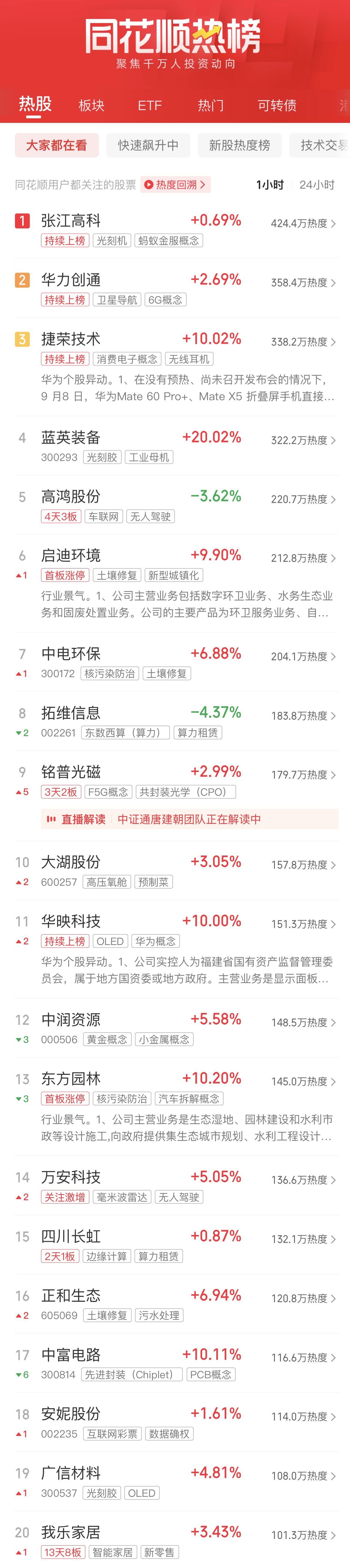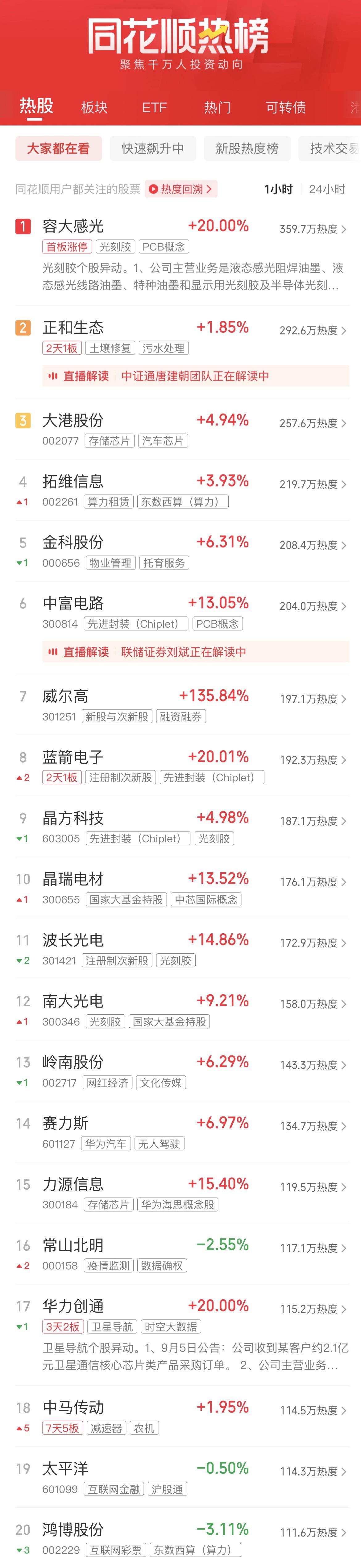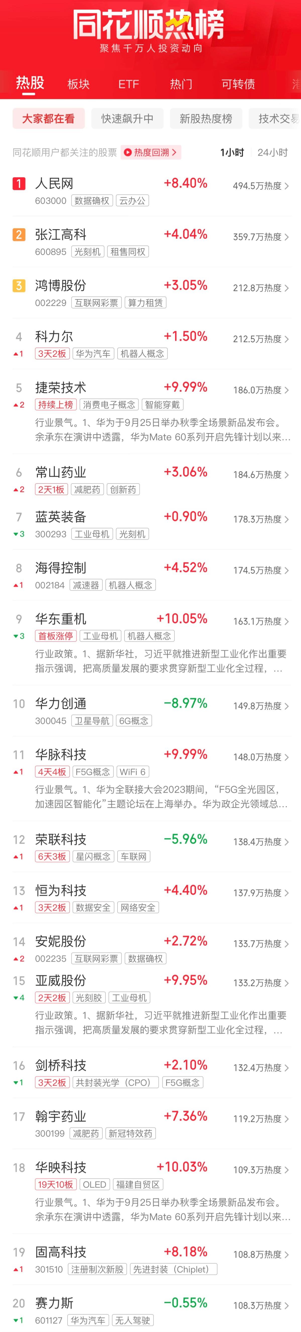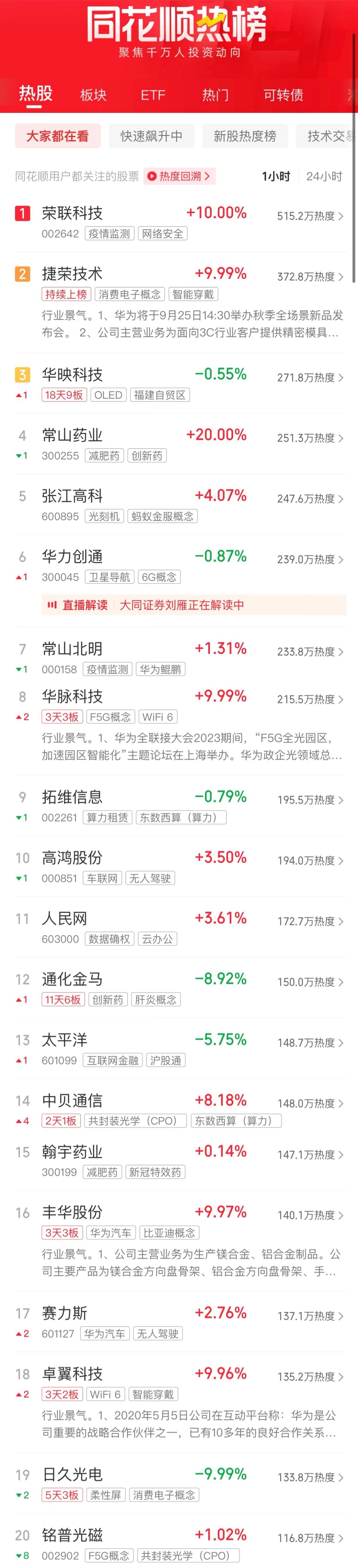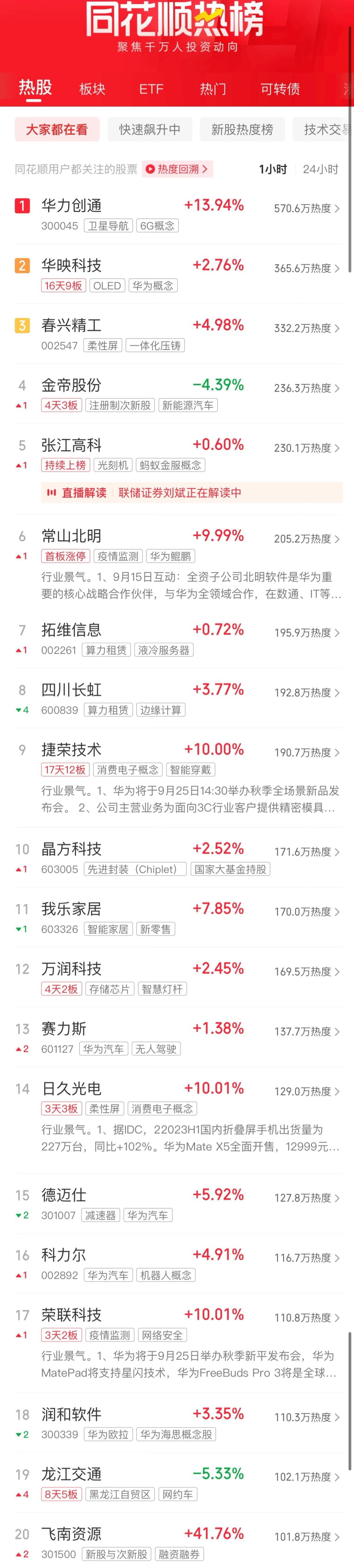 14:23 华为星闪概念持续活跃,荣联科技尾盘涨停,创耀科技、高鸿股份(000851)、光峰科技、九联科技等纷纷跟涨。消息面上,华为秋季全场景新品发布会将于9月25日14:30举行。